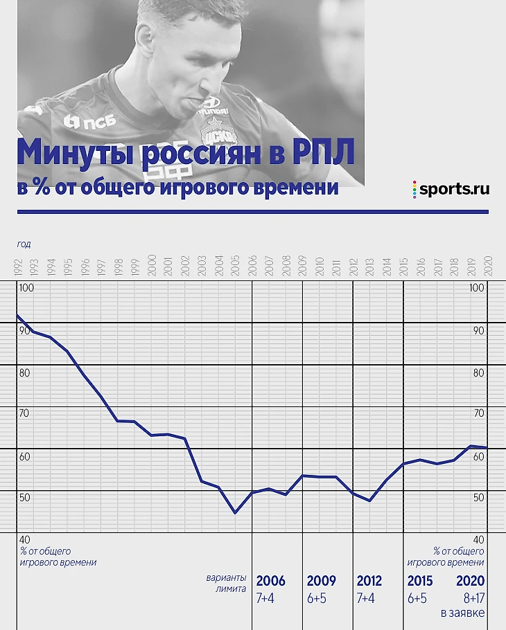 Видно, что в 90-е и начале нулевых игровое время российских футболистов пугающе сокращалось, и введение лимита – вполне естественная реакция на процесс. Неизвестно, как глубоко бы провалилась кривая без ограничений, но известно, что именно лимит ее стабилизировал.
