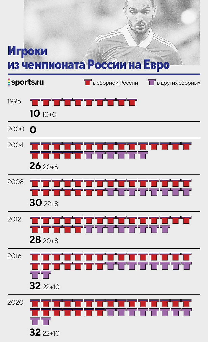 Речь не только про сборную России. 2016-й год – пик! 22 игрока в сборной России и еще 10 – в других. Сейчас цифры такие же, но учитывайте, что и футболистов на Евро больше: 26 игроков в заявке вместо 23.