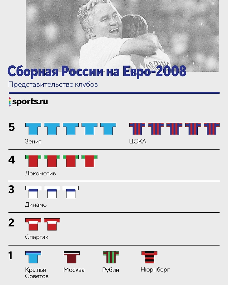 2008-й, «Зенит» и ЦСКА – базовые клубы сборной. Кроме Малафеева, все игроки питерцев были основными: Широков, Анюков, Зырянов и Аршавин. У ЦСКА похожая история, в основе – Акинфеев, Василий Березуцкий, Игнашевич и Жирков.