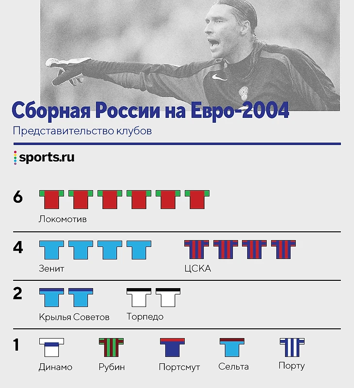 Середина нулевых – лучшее время в истории современного «Локомотива». Неудивительно, что сборная собиралась из игроков Юрия Семина. Заметен и подъем «Зенита», на Евро-96 не было ни одного игрока, а здесь – сразу четыре: Малафеев, Радимов, Быстров и Кержаков. И да, никого из «Спартака» – это были времена Люка Зоа, Горана Тробока и Игнаса Дедуры, Аленичев на момент Евро еще принадлежал «Порту».