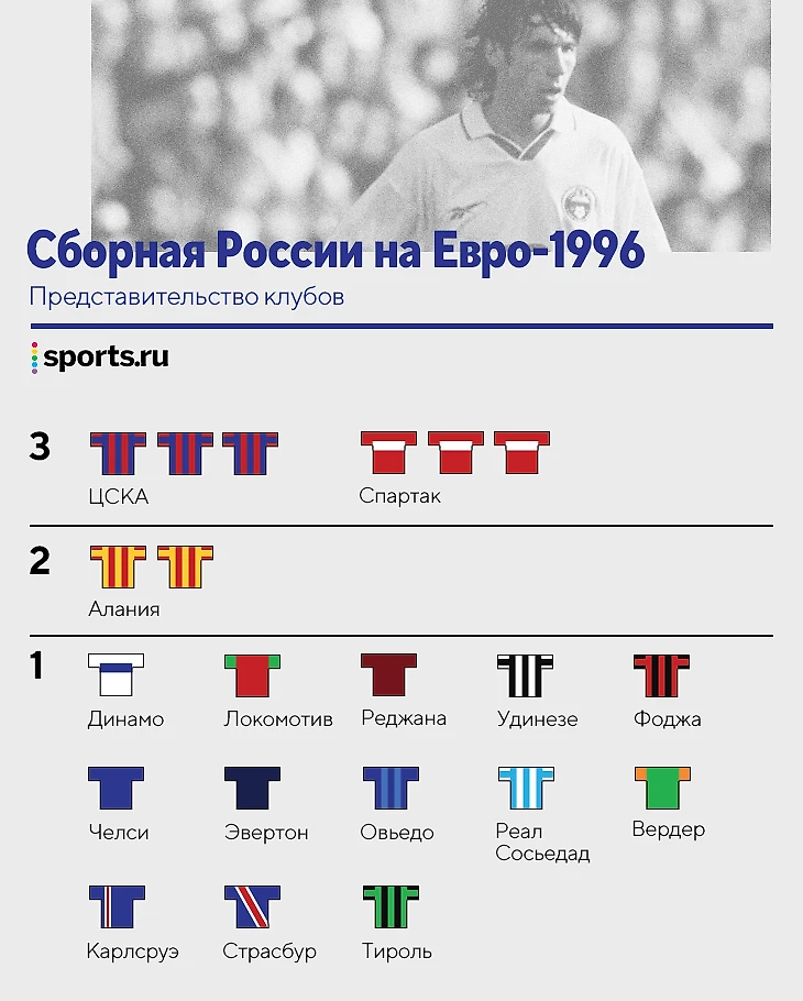 Сначала внимательнее присмотримся к тому, из игроков каких клубов складывалась сборная России на чемпионатах Европы. Начнем с 1996-го.