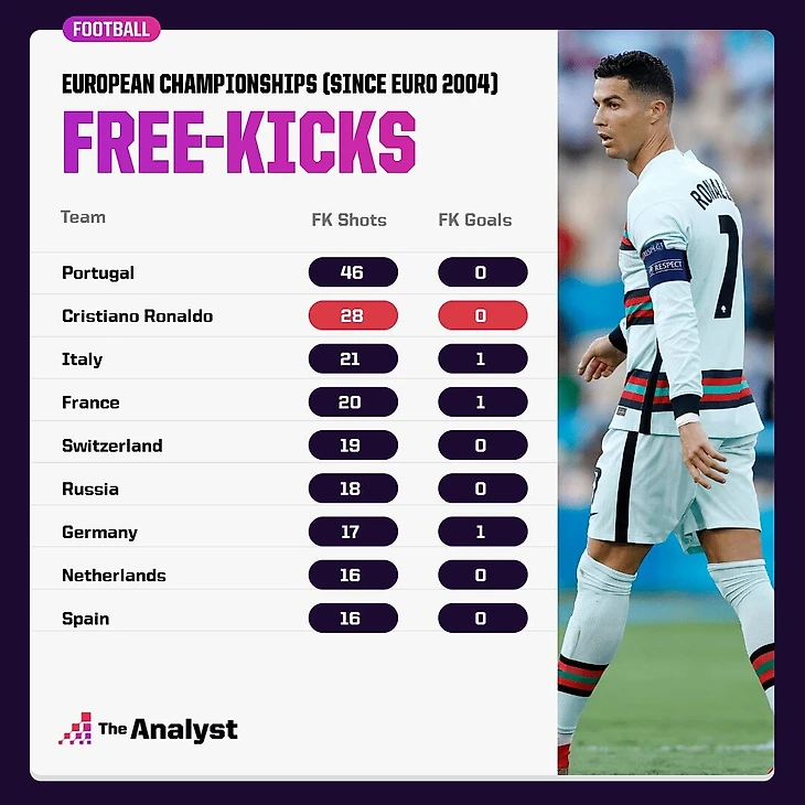 2. За этот же отрезок один только Роналду бил штрафные на Евро чаще, чем сборные Италии, Франции и Германии.
