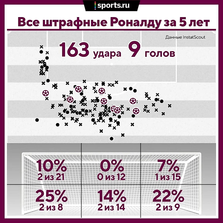 Итог: Роналду точно не лучший в мире исполнитель штрафных и, вероятно, даже не в тройке лучших (по статистике), хотя бьет очень часто.