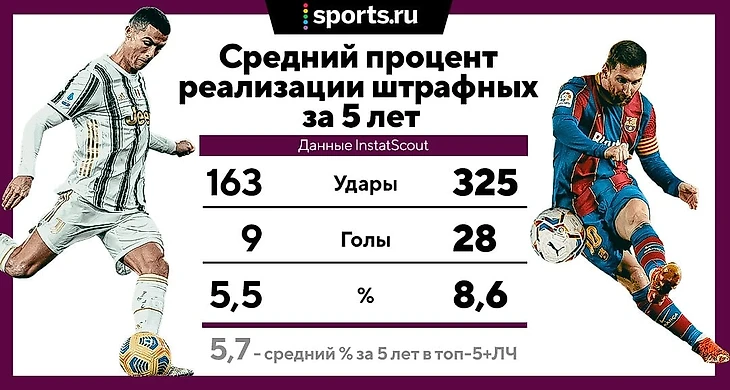Другой важный момент: так как гол со штрафного – редкое событие, статистика не совсем отражает реальность, она точно не повод для железных выводов. Например, если Роналду забьет два штрафных за три месяца, его процент будет уже выше среднего. В этом показателе большую роль играет случайность.