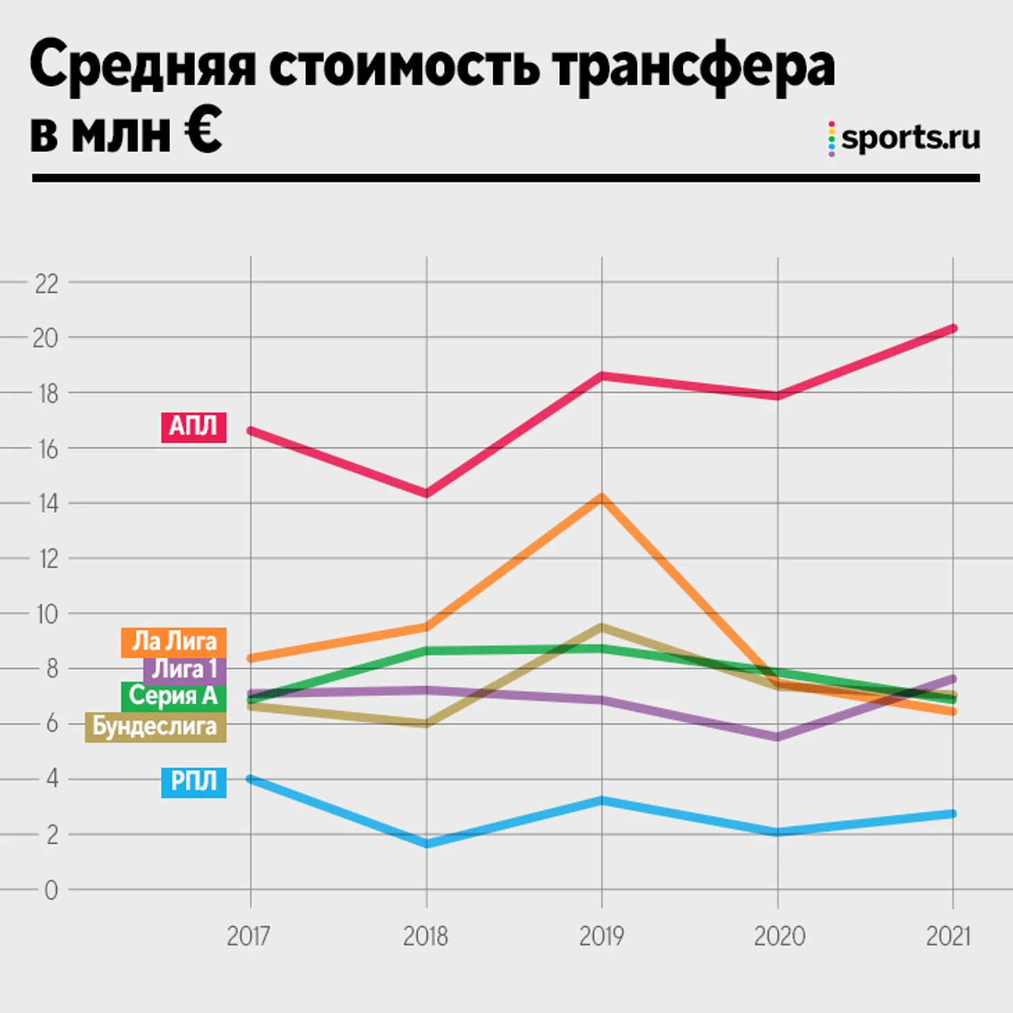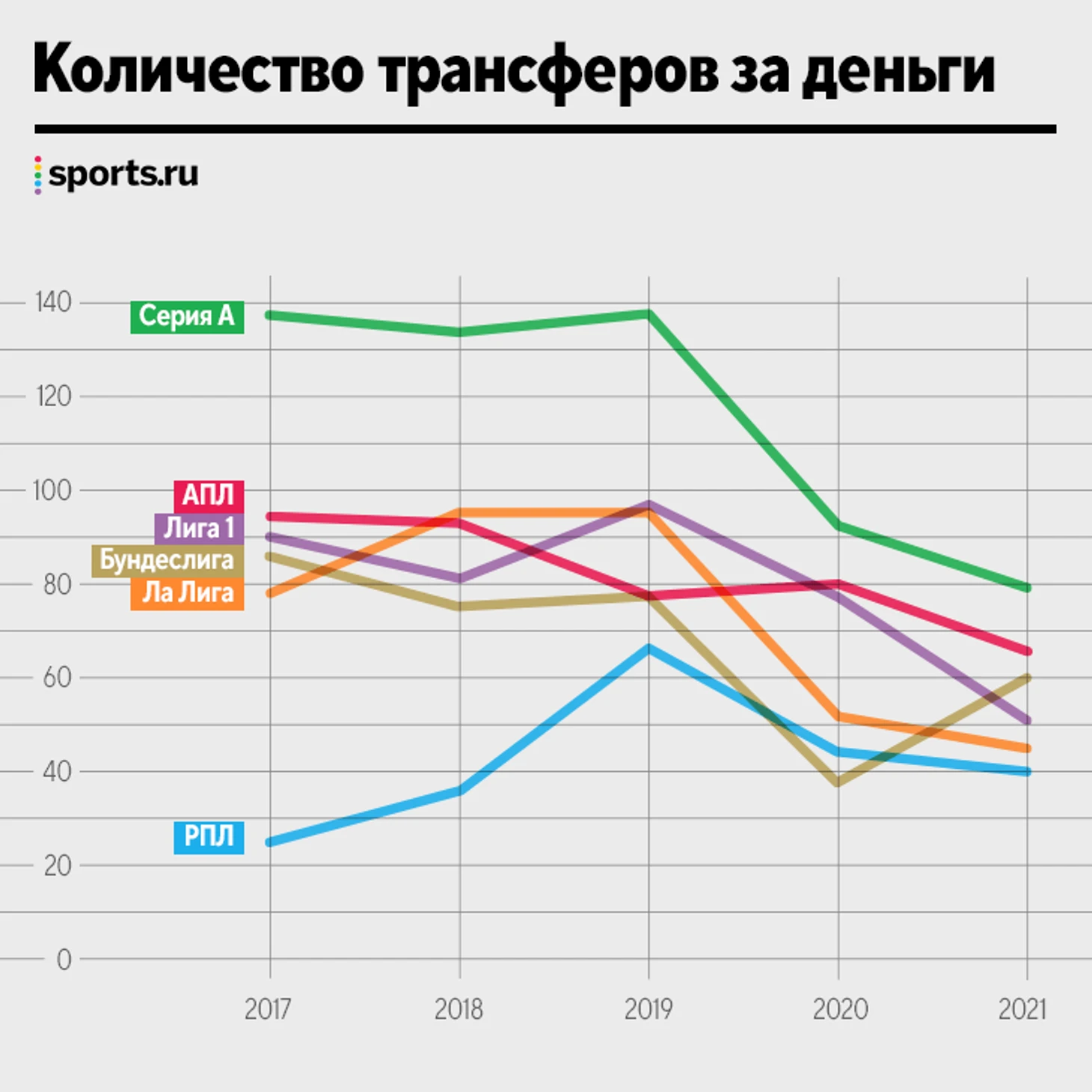 • Общие трансферные расходы почти везде просели, исключение – только АПЛ. Средний чек подешевел в Ла Лиге, Серии А, Бундеслиге и РПЛ.