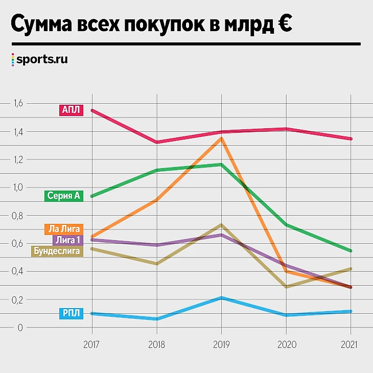 А вот в Ла Лиге – драма. Если в 2019-м средний чек в летнее окно – 14 млн евро, то сейчас – 6,5. В Серии А, Бундеслиге и Лиге 1 игроки никогда не стоили так дорого, поэтому падение там не такое значительное. В Германии тенденция к снижению средней стоимости трансфера на фоне увеличения общих расходов, то есть клубы теперь покупают больше, но дешевле. В Лиге 1 рост из-за распродаж талантов в «Лилле», «Марселе» и «Ницце».