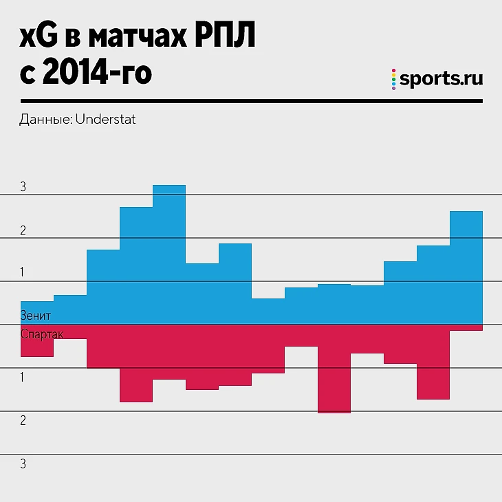 По результатам – да. C 2014-го команды провели в РПЛ 14 матчей, 6 побед у «Зенита», 2 у «Спартака». Но что по качеству? Ниже – статистика ожидаемых голов по чемпионату России (доступна с 2014-го), смотрим, как менялись расклады в очных матчах.