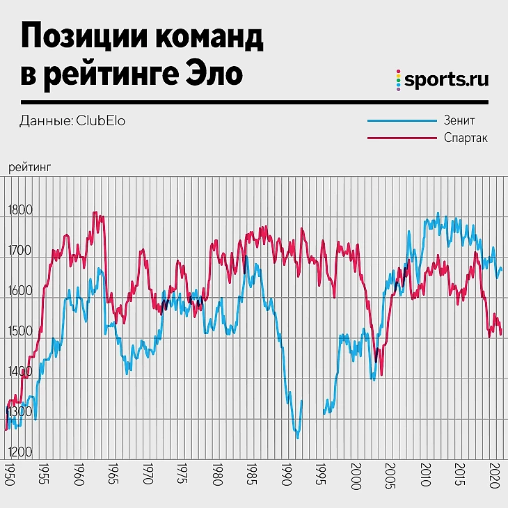 Сравнивать исторические расклады и просто, и сложно. Можно взять процент побед и посчитать титулы, но есть риск упустить детали. Ведь уровень конкуренции в чемпионатах СССР и России никогда не был одинаковым, очки в разные годы стоили по-разному. Пока в исторической футбольной статистике не придумали ничего лучше методики Эло, ее упрощенная версия используется в рейтинге ФИФА, а также в шахматных рейтингах ФИДЕ.