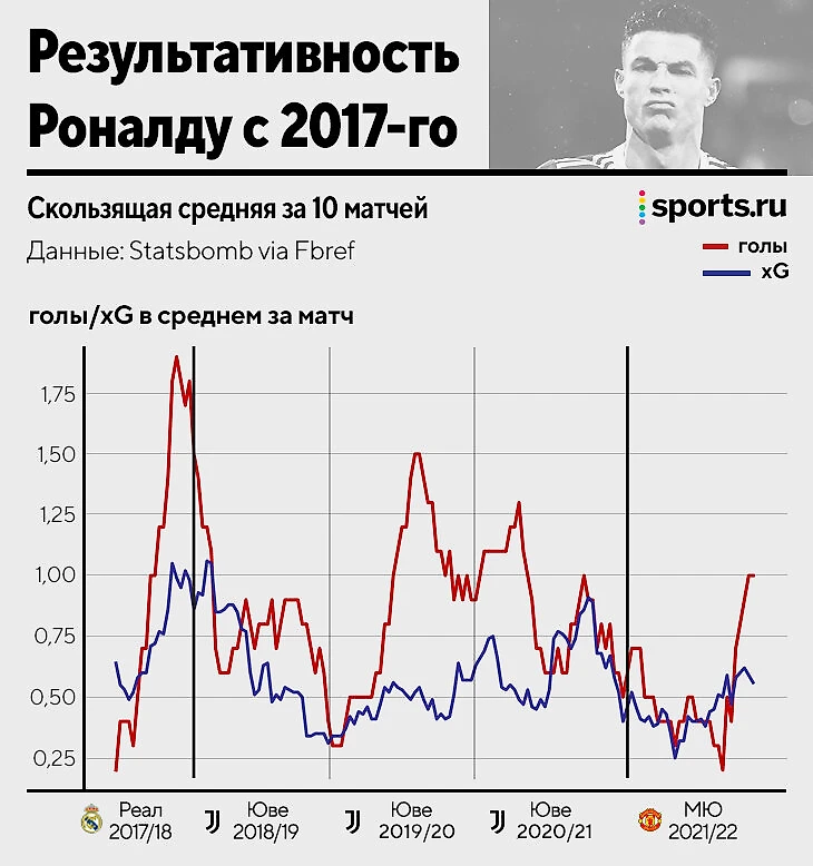 Но с 2018-го будто бы что-то резко сломалось. С этого момента Роналду играл в командах, которые как минимум не прибавляли в долгосрочной перспективе, а скорее даже шли в тупик. Это подтверждают и данные, и оценки боссов клубов (просто так не меняют тренеров), и впечатления болельщиков (возможно, большинства).