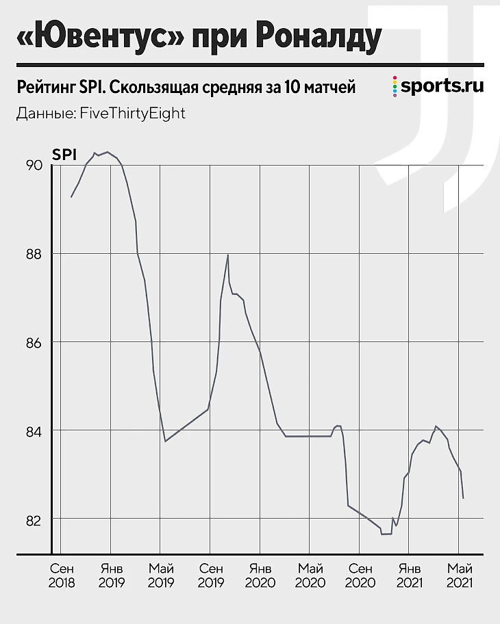 Сложно спорить, что «Юве» перед подписанием Роналду и перед его уходом – команды разного уровня. Индекс FiveThirtyEight фиксирует гигантскую разницу.