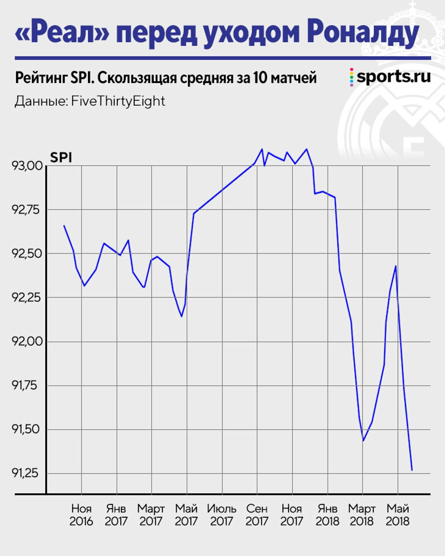 На графике два сезона «Реала» перед расставанием с Криштиану. Удивительное совпадение: при первых слухах о недовольстве Роналду «Мадрид» полетел вниз, и весна получилась турбулентной – плохая концовка в Ла Лиге (3-е место), вылет из Кубка Испании, но при этом успехи в ЛЧ и даже кратковременный рост индекса SPI, который сменился еще более глубоким падением. В 2018-м «Реал» столкнулся с системными игровыми проблемами, которые маскировались удачными результатами в Лиге чемпионов.