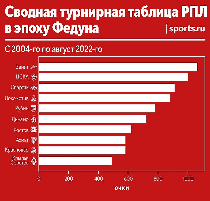 Больше 1000 очков набрали только два клуба – «Зенит» и ЦСКА. У «Спартака» при Федуне – 912 и третье место. Отставание от второго места – приличное (91 очко).