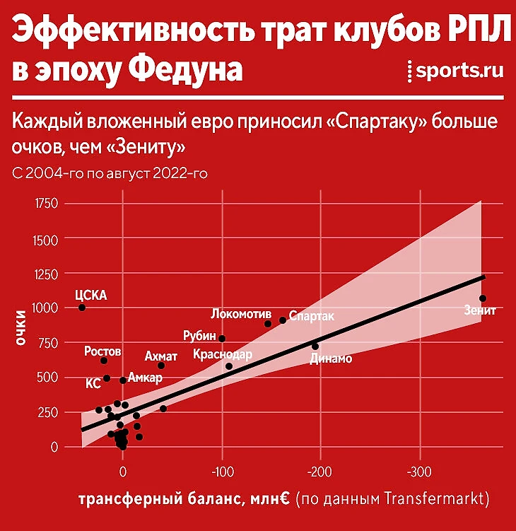 Выводы: каждое очко «Зенита» стоит дороже, чем спартаковское (если оценивать только трансферы), и даже ниже среднего по РПЛ.