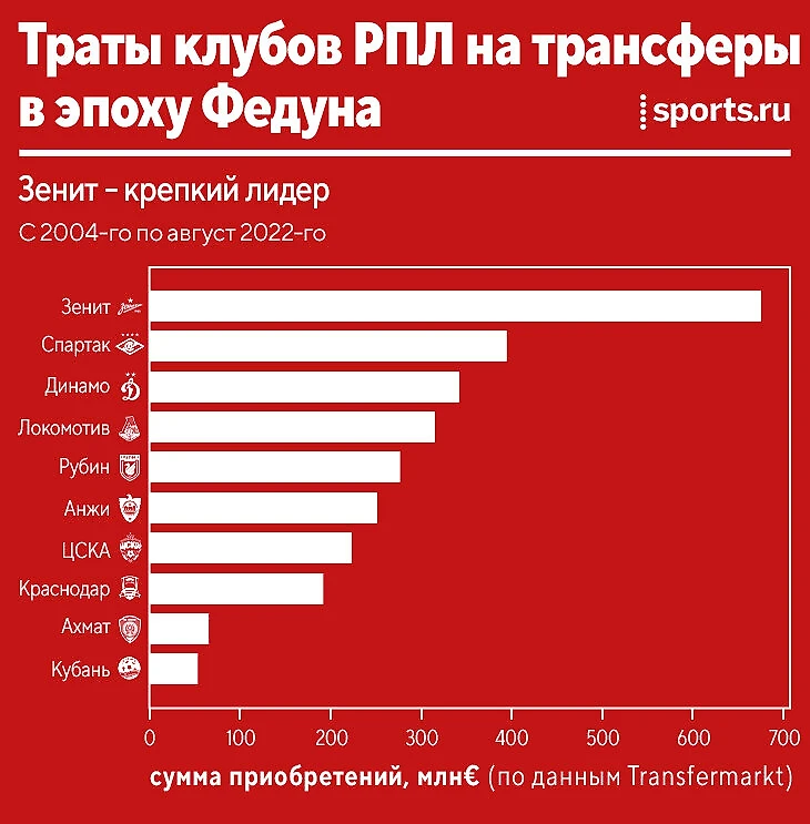 «Спартак» второй с огромным отставанием – 392 млн на игроков за 18 лет. Также больше 300 потратили «Динамо» и «Локомотив». Кстати, «Спартак» за эпоху Федуна потратил на игроков больше, чем, например, «Атлетик» и гладбахская «Боруссия».