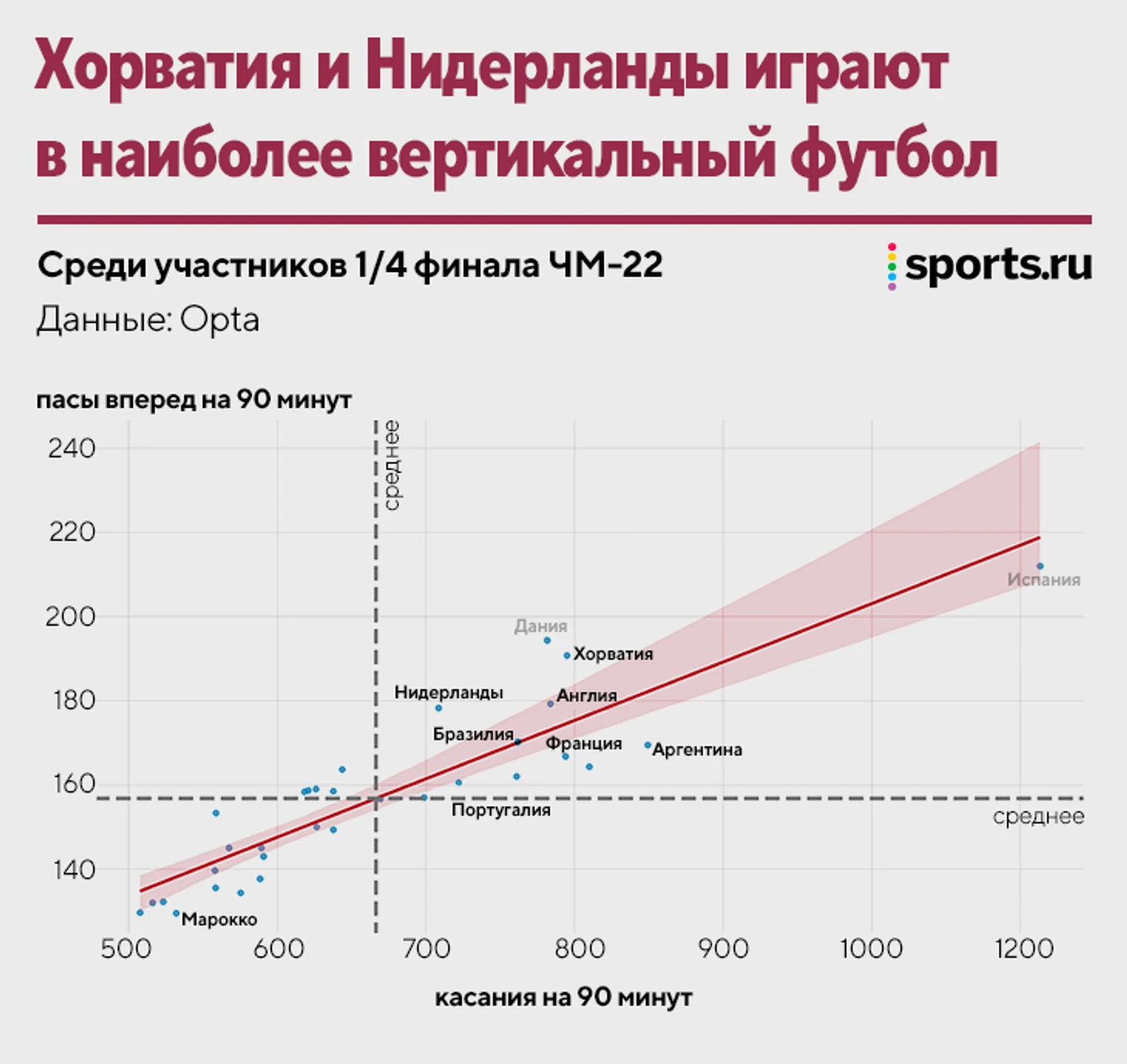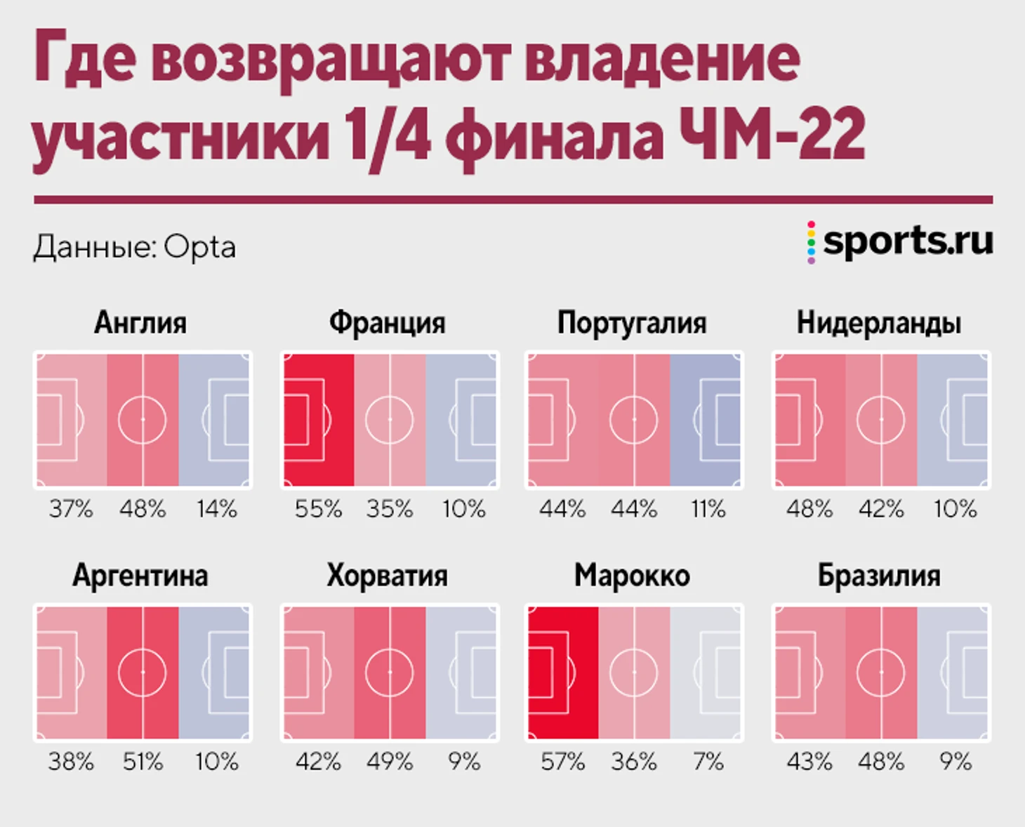 • Обратите внимание, что похожий расклад у Франции и Аргентины, но на поле это не так бросается в глаза, потому что они банально меньше держат мяч и хоть иногда, но рискуют.