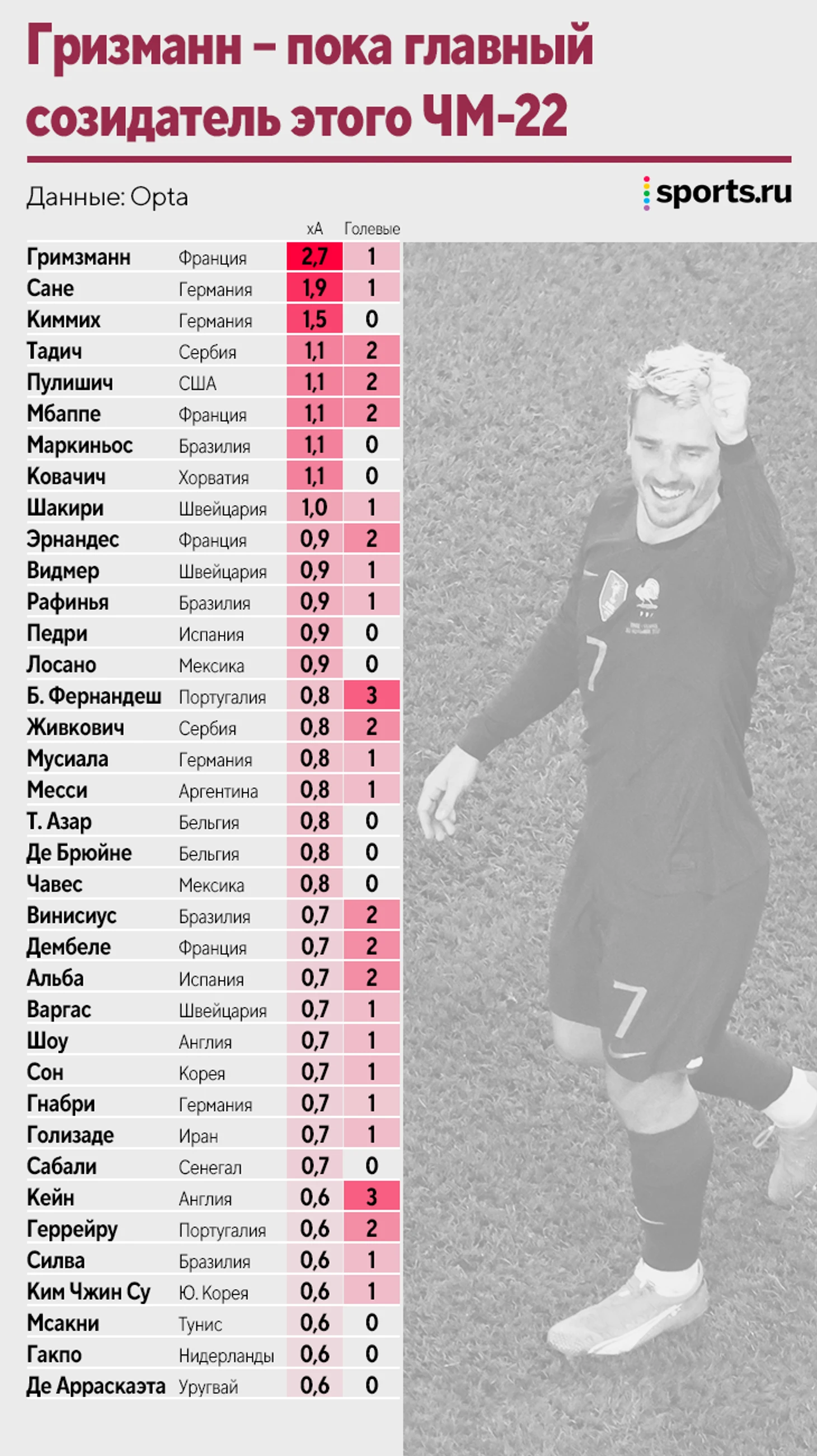 Ближайшие к Гризманну участники четвертьфинала из других команд – Маркиньос и Ковачич – отдали на 1,6 xA меньше. Огромный отрыв.