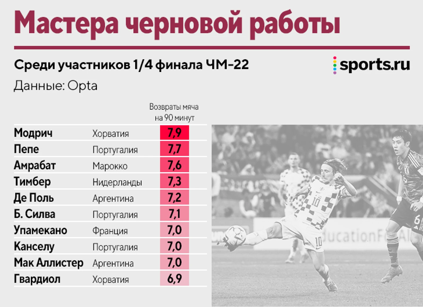 Лука Модрич в этот топ пока не влетел (xA – только 0,5), но перед матчем с Бразилией не отметить его величие нельзя. В 37 он один из самых работоспособных игроков турнира – лидер по возвратам мяча среди четвертьфиналистов!