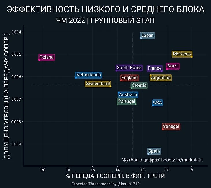 Наоборот, эти примеры доказывают, что низкий блок может быть разным – пассивным и агрессивным. Франция и Марокко выбирают как раз второй вариант. Очень показательная картинка телеграм-канала «Футбол в цифрах».