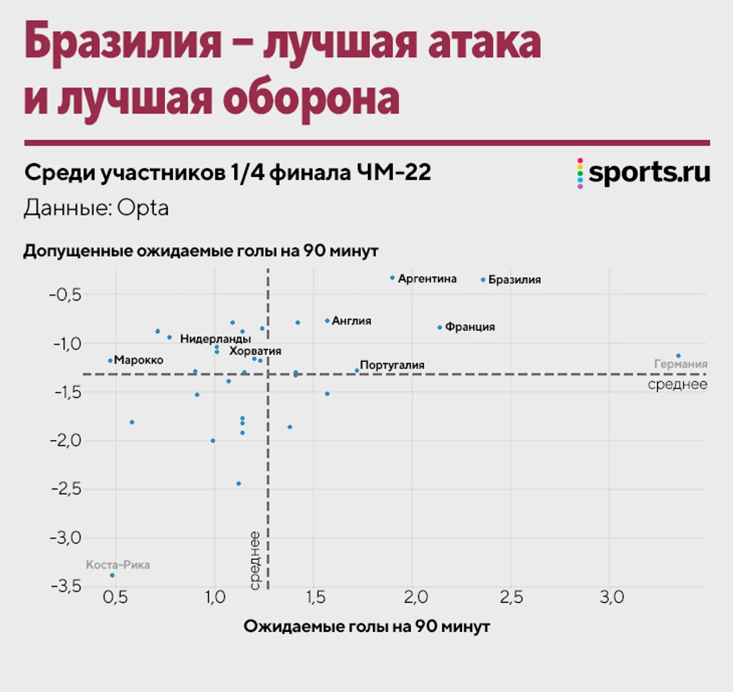 • Бразилию на этом ЧМ хвалят за крепкую оборону (и по делу, допускают очень мало наравне с аргентинцами), но при этом впереди они создали больше остальных – почти 2,4 гола за игру. Больше только у вылетевших немцев – 3,35.