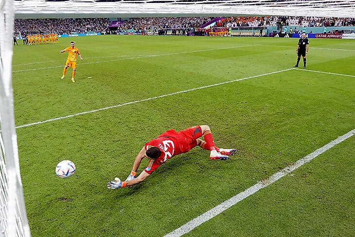 Кипер Аргентины Эмилиано Мартинес – главный герой серии пенальти 1/4 финала ЧМ против Нидерландов. Взял два стартовых удара, во многом предопределив исход. Важно: Мартинес делал именно полноценные сэйвы, вытаскивая сложные мячи – сначала из правого угла, затем – из левого.