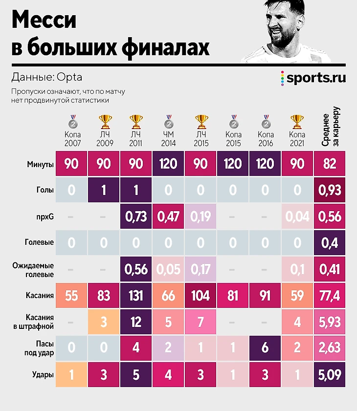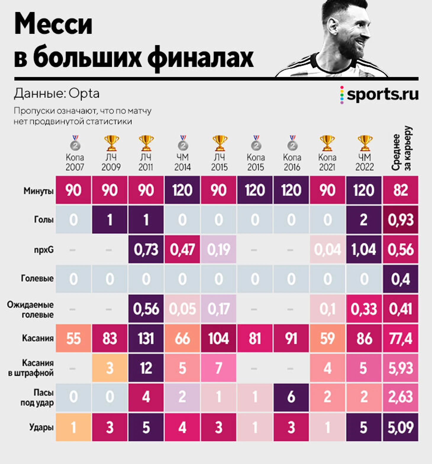 Перед решающим матчем ЧМ-2022 мы оценили все большие финалы в карьере Лионеля Месси через продвинутую (и не очень) статистику.