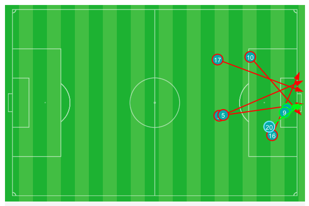 Ниже – сетка связей. Точка – усредненное положение футболиста при игровых действиях, линии – передачи между игроками. Синий цвет точки – футболист минимально обострял игру передачами в первые 23 минуты, красный – максимально. Чем толще линия – тем больше передач.