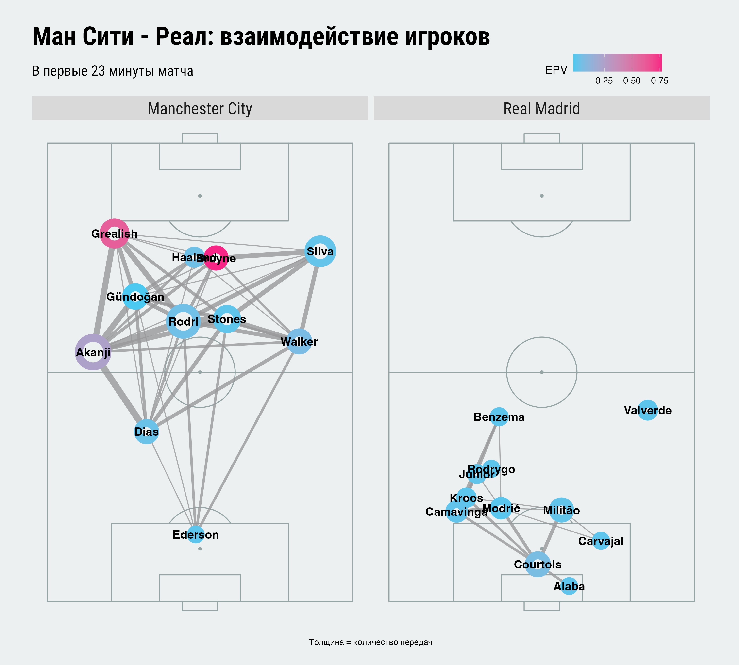 А вот игровое взаимодействие: Родри отпахал с мячом больше, чем весь «Реал»