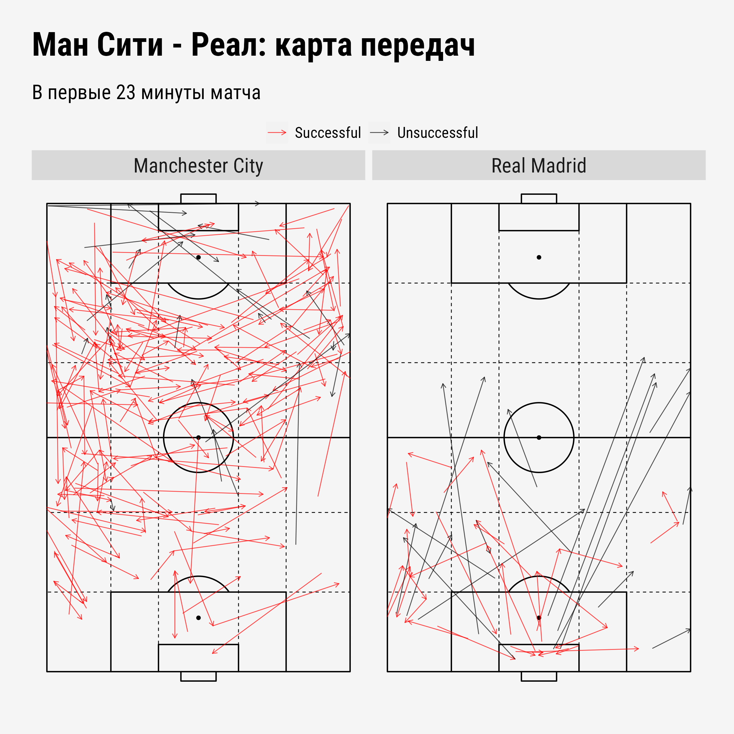«Сити» совершил 263 передачи с точностью 89%. Сколько темных стрелок (они отражают неточные пасы) сможете насчитать слева? А справа?