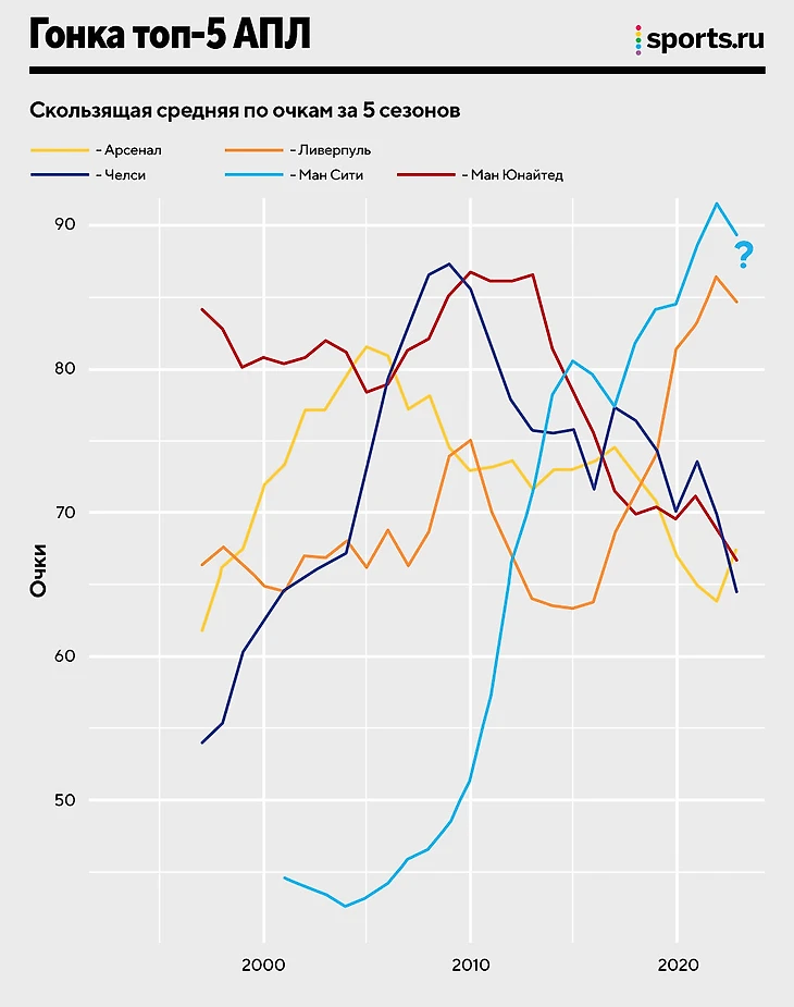 • В середине нулевых вперед ненадолго вырвался «Арсенал», а затем и «Челси» (какой взлет!).