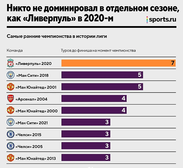 • «Ливерпуль» из-за ковидных сдвигов календарно оформил самое позднее чемпионство в истории – 25 июня. Но по футбольному календарю оно было самым ранним – за 7 туров до финиша. Абсолютный рекорд!