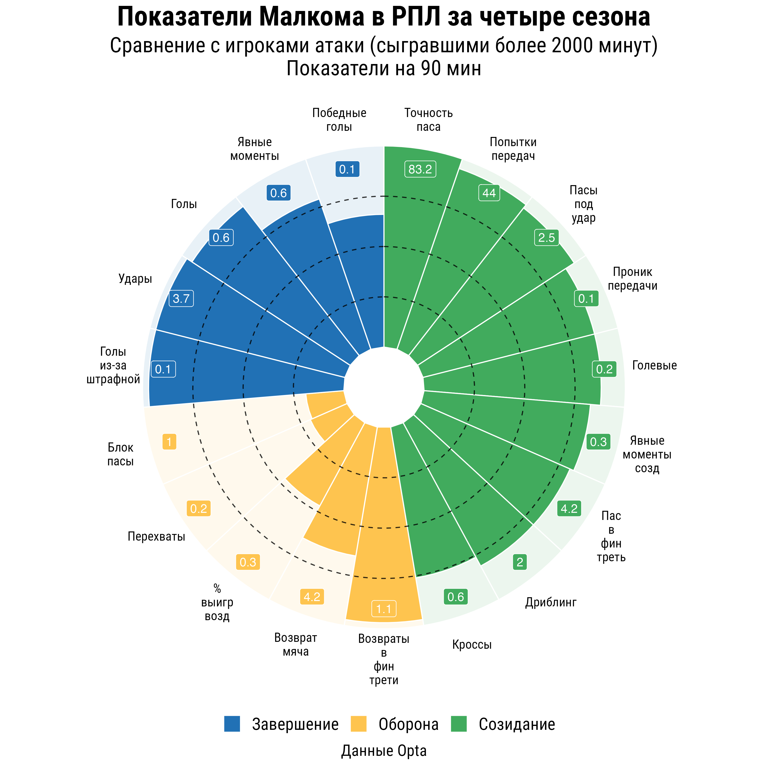 Яркость Малкома при завершении красиво дополняют его созидательные способности. Близок к лидерству среди атакующих игроков и по проценту точных передач, и по передачам под удар на матч, и по голевым, и по дриблингу, а еще – по проникающим пасам (редкий навык для игрока РПЛ – то, чего не хватает «Зениту» без бразильцев).