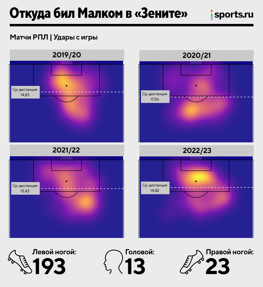 Интересно, что второй по результативности (на 90 минут) для Малкома – как раз его первый российский сезон. Тогда он тоже часто заходил в штрафную для удара, но из-за проблем со здоровьем сыграл всего 827 минут, забив 4 гола.