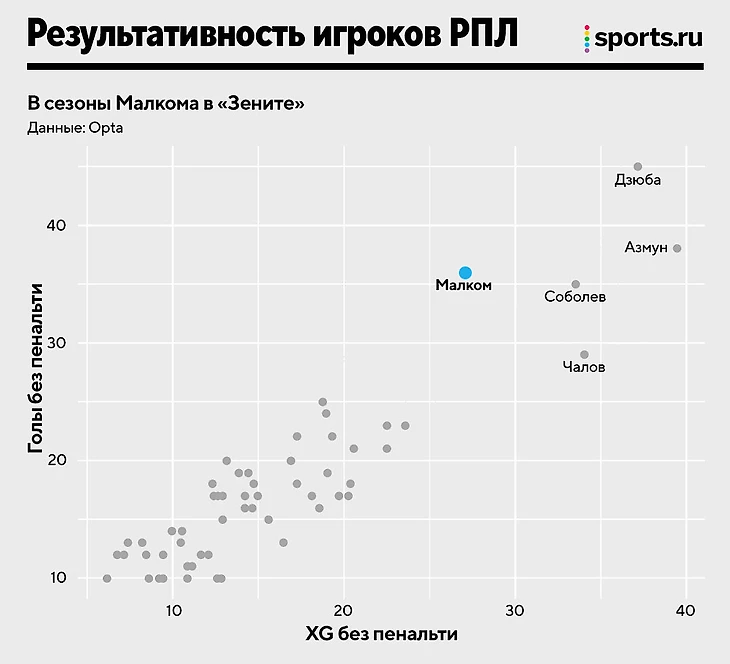 Но ожидаемые голы – не единственная продвинутая метрика успеха Малкома в России.