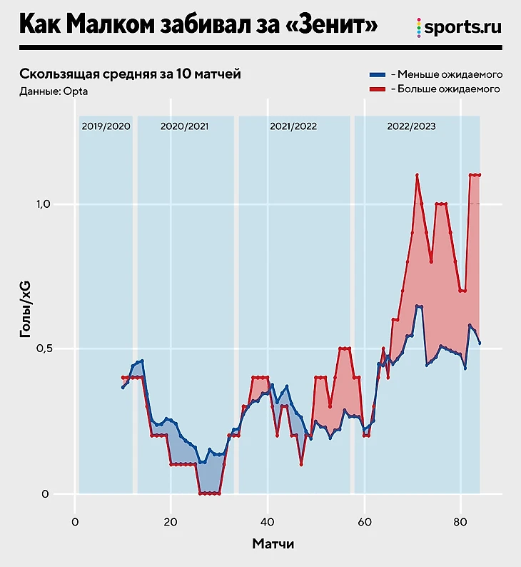 График ниже здорово иллюстрирует, как резко прибавил Малком год назад. Красная кривая – голы, синяя – xG. Если красная выше, значит футболист забивает больше ожидаемого, если синяя – наоборот. Заметно, что с середины сезона-2021/22 резко подскочила реализация – даже аномально резко. В прошлом чемпионате Малком забивал в полтора-два раза больше ожидаемого, хотя в начале российской карьеры была обратная проблема.