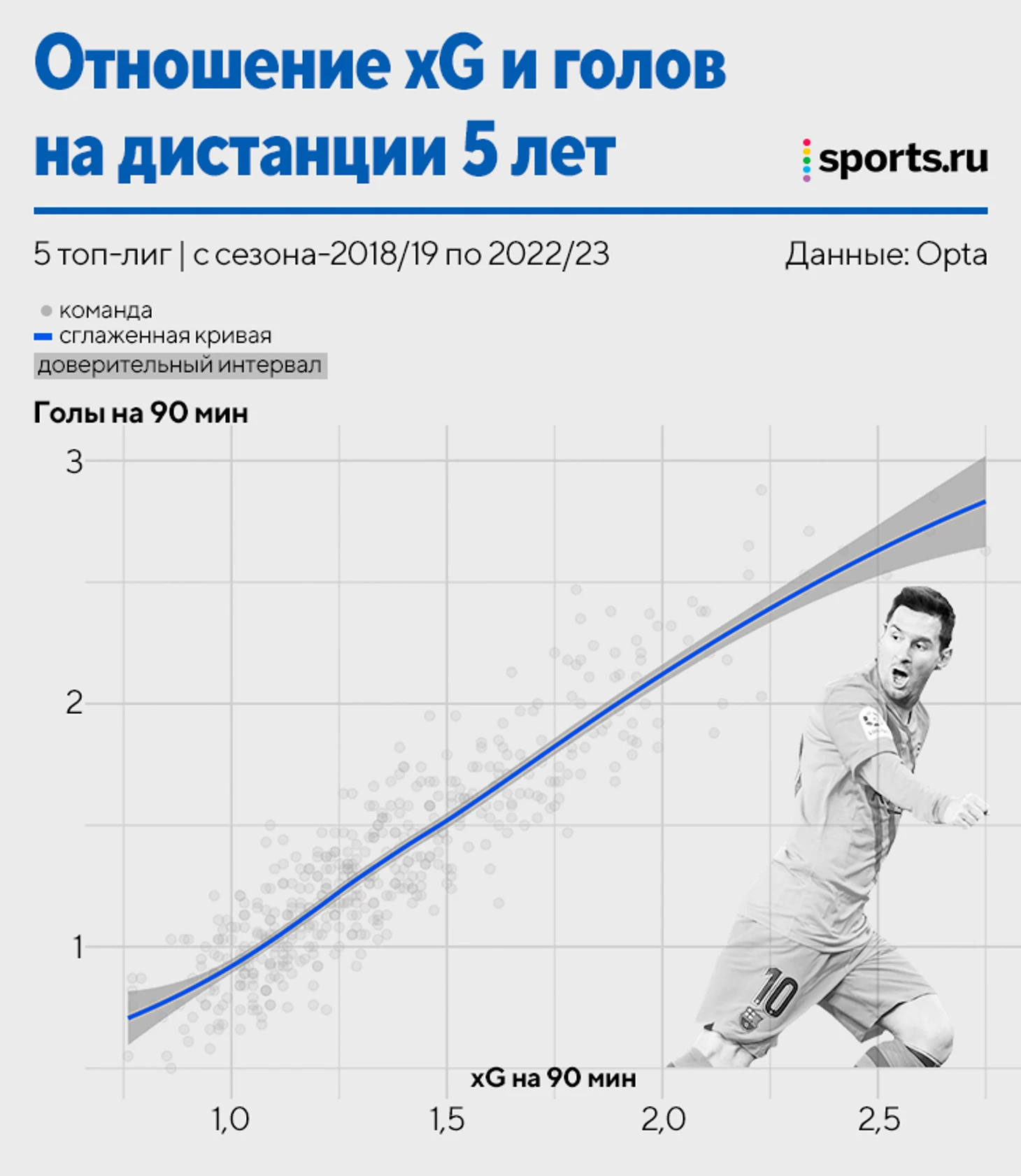 Модель xG от Opta построена на базе 2,5 млн ударов футболистов разного уровня. Это значит, что она отражает среднестатистическую ценность удара среднестатистического футболиста.