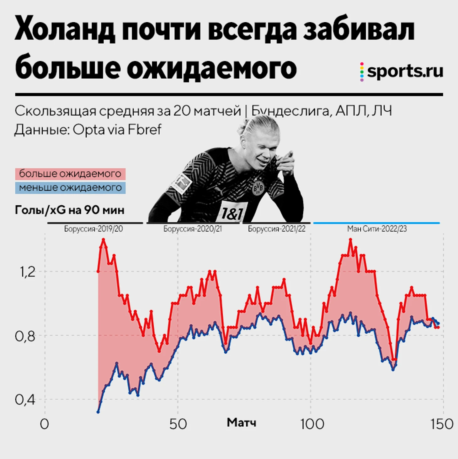 Например, вот график Эрлинга Холанда за карьеру в топ-5 лигах. Красная кривая – голы, синяя – xG. Если красная выше, значит Холанд забивал больше ожидаемого.