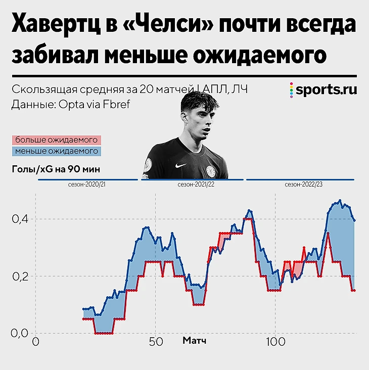 Причин разницы в реализации может быть множество, она может меняться от сезона к сезону, от позиции к позиции, от команды к команде (например, в «Байере» показатели Хавертца были лучше). Возможно, топ-клуб создает условия для реализации, пока не уловимые продвинутыми метриками (пространство, темп или что-то еще).