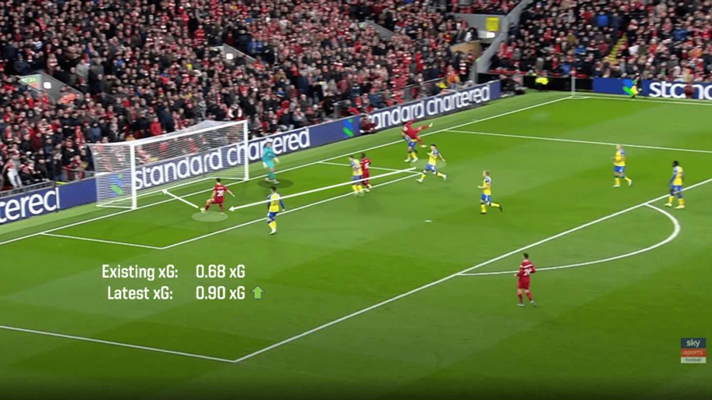 Прежняя версия оценивала этот удар форварда «Ливерпуля» Жоты в 0.68 xG – ниже, чем пенальти. Новая выдает более реалистичный показатель – 0.9.
