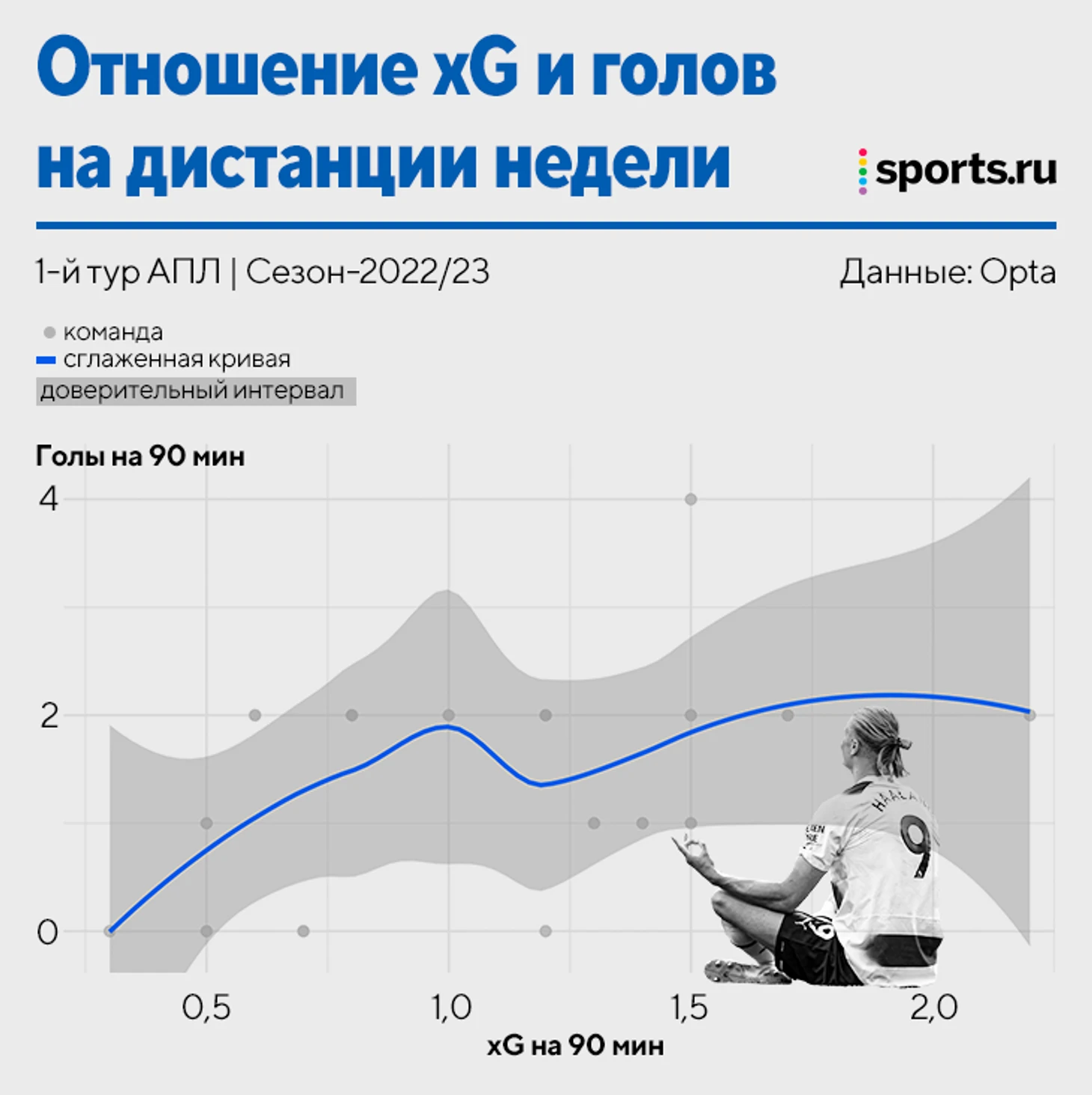 Точки будто рандомно рассеяны по графику. У 50% команд два гола за тур, но показатель xG у них скачет от 0.6 до 2.4. Какую-то зависимость выявить сложно. И если смотреть на это, то вопросы Валерия Карпина можно понять. Что это? Зачем это?