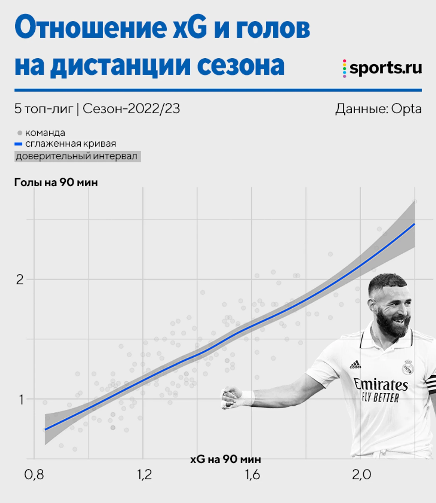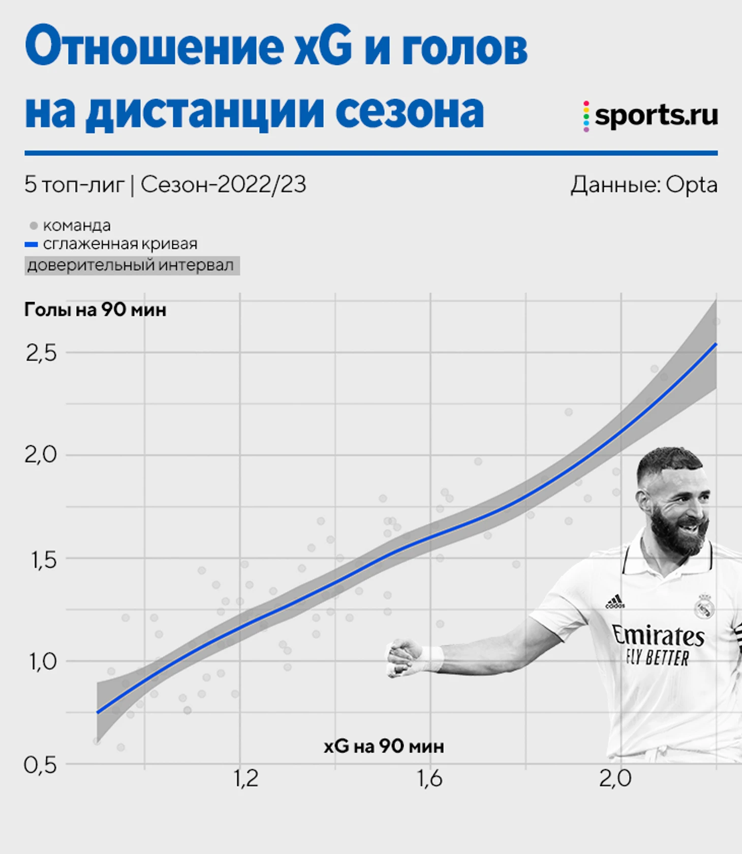 И здесь прямая зависимость между голами и xG на дистанции еще четче.