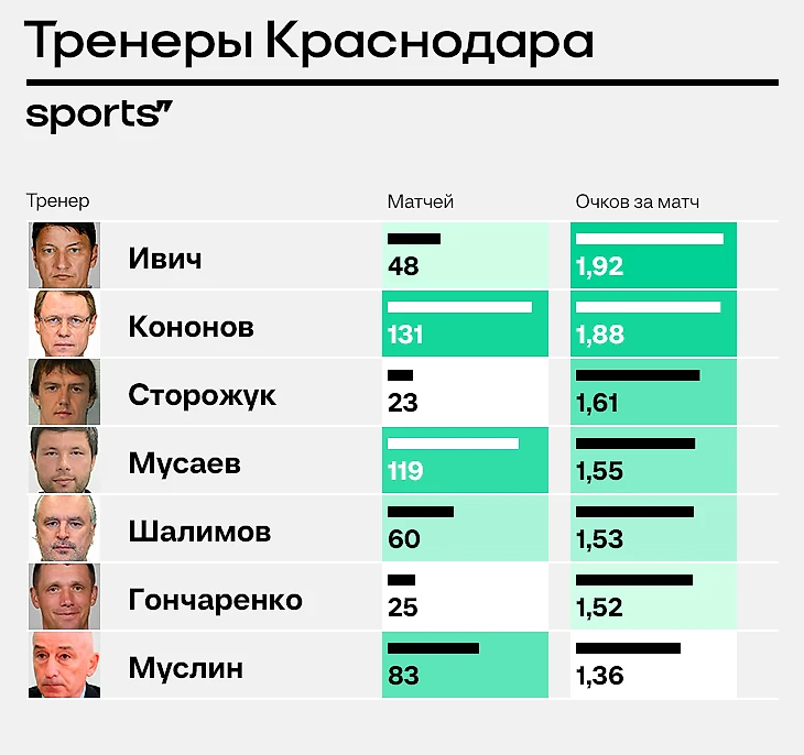 Олег Кононов очень близко, и его показатель, возможно, даже ценнее – поскольку дистанция гораздо дольше. Замыкает список Славолюб Муслин, при котором «Краснодар» еще не считался топ-клубом и только-только начинал в РПЛ.