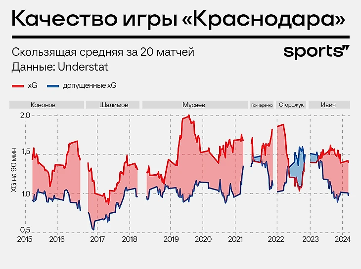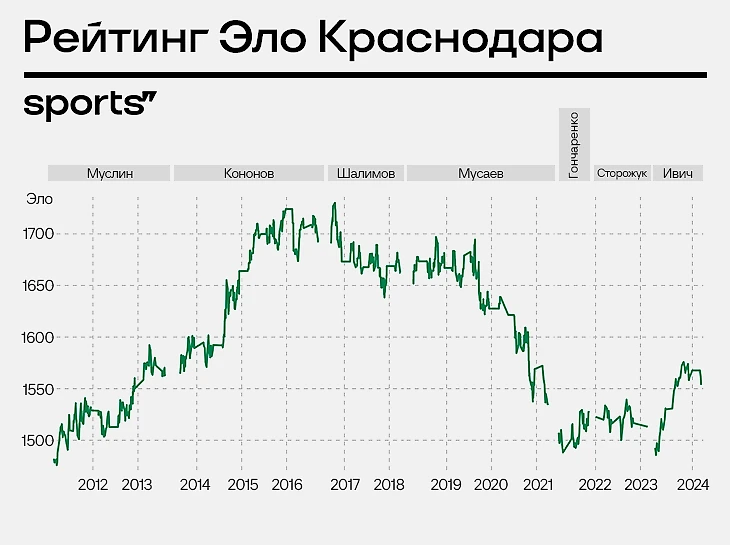 Дальше «Краснодар» сохранял уровень с незначительными спадами, появился в 1/8 Лиги Европы и при Мураде Мусаеве, но дальше – крутейший спад на несколько лет. Сломить кривую удалось только Ивичу.