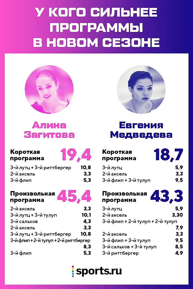 Там их можно будет сравнить с эталонами предыдущих сезонов – Медведевой и Загитовой. И в чью пользу окажется сравнение – вы точно не угадаете.