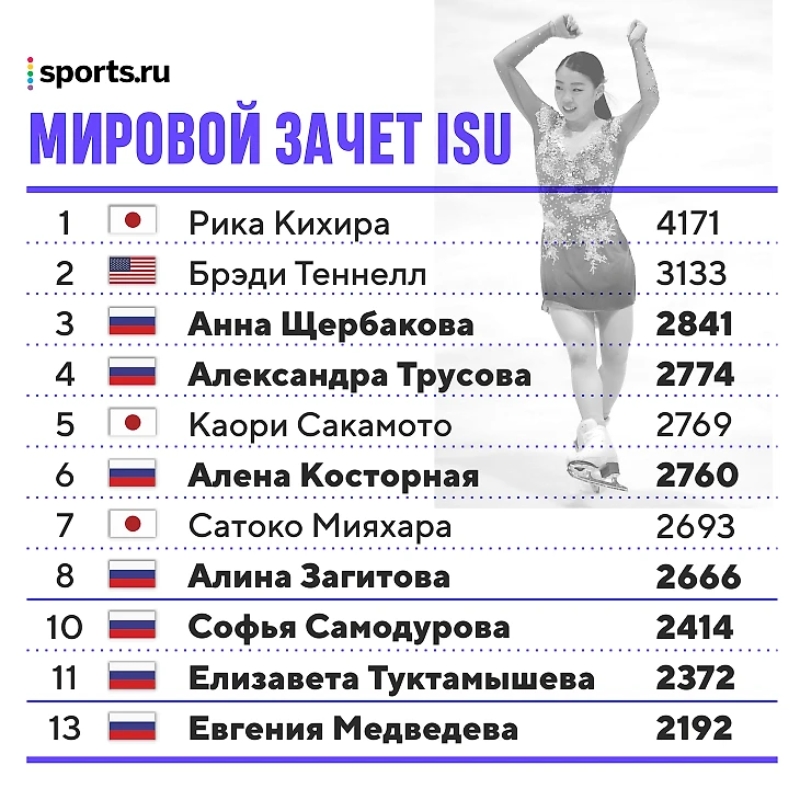 4) Есть и индивидуальные нюансы: например, Косторная из-за пропущенного ЮЧМ-2019 потеряла около 300 баллов – их точно хватило бы, чтобы войти в топ-3 рейтинга.
