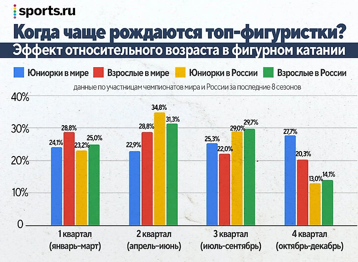 • На масштабном отрезке длиной в последние 6 лет бросается в глаза, что большинство фигуристок родилось во втором квартале: среди взрослых в элитной группе (участницы чемпионатов России) их 31,8%, а по юниоркам (участницы юниорских чемпионатов России) – вообще, 34,8%.