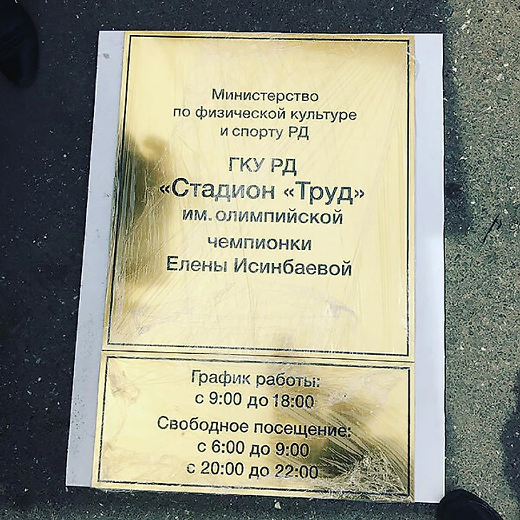«В связи с постановлением правительства Республики Дагестан от 18.08 2023г. №335 о переименовании Стадиона им.Е. Исинбаевой на ГБУ РД «Стадион «Труд», производится демонтаж прежнего названия», – а это уже свежий контент, замкнувший круг.
