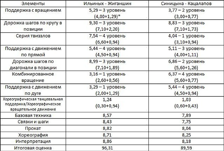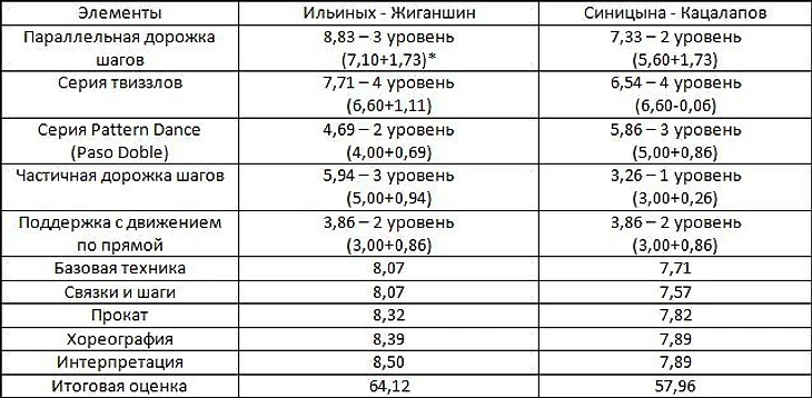 *в скобках – базовая оценка за элемент данного уровня сложности + судейская надбавка за качество исполнения