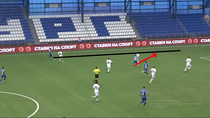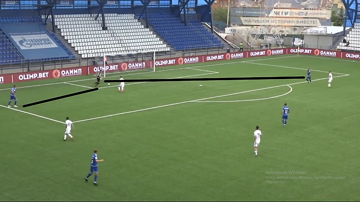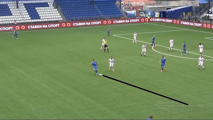 Как видим, у "Оренбурга-2" фланги открыты и у Нарылкова два варианта для продолжения атаки (правый или левый фланг). Сергей отдает пас на правый фланг, т.к. пас в центр может обойтись потерей мяча.