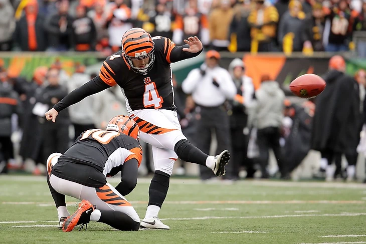 Это была 4-я игровая неделя и Бенгалс играет в Атланте. Ровно в 11:33 Рэнди Буллок, кикер Цинциннати Бенгалс начинает разминку, начало матча в час дня. Начиная с коротких ударов, устанавливает наш мяч вертикально на 10-ярдовой линии, балансируя его рукой металлического держателя. Расположившись в нескольких ярдах позади мяча и слева, он наклоняется вперед на согнутой левой ноге и делает три шага в сторону мяча, влево, вправо, влево. Затем он размахивается правой ногой, как маятником и поднимает мяч в воздух. Хороший удар ногой.