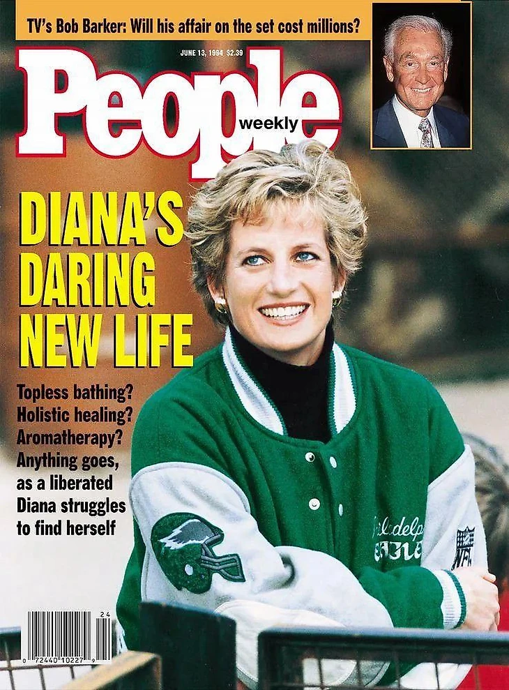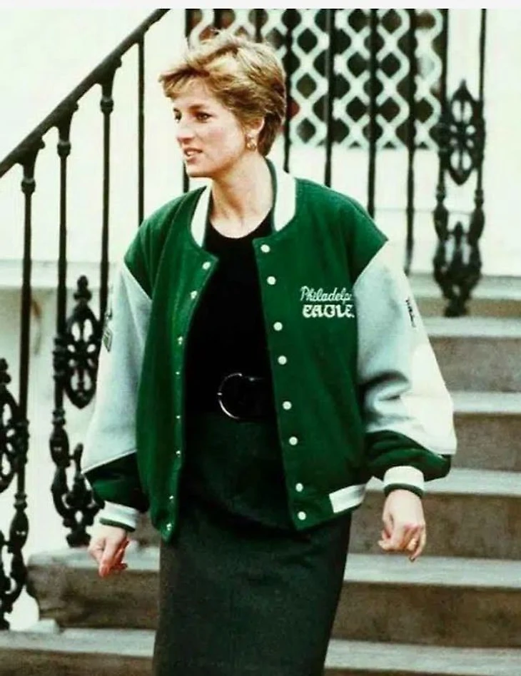 Принцесса Диана была в зелено - серебряной куртке - бомбере "Филадельфии Иглс", которая, как написало одно издание: "Придавала её блестящим голубым глазам дополнительную выразительность".
